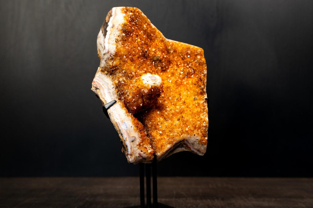 The first thing we notice is the overall beauty of the cluster and how intact the formations and citrine points are. They formed over a curving geode surface, creating peaks and valleys of sparkling druzy. When viewed up close, tiny micro-calcite crystals can be spotted, adding a rare and delicate detail to the piece.