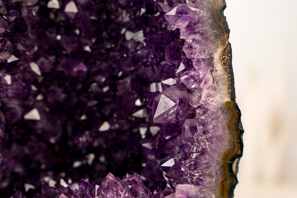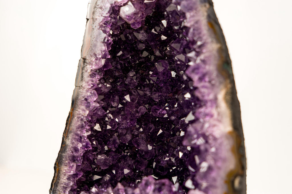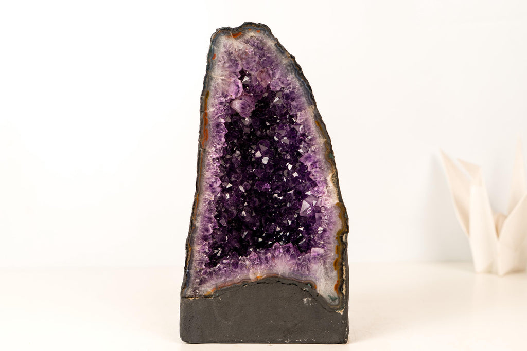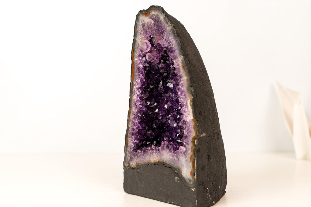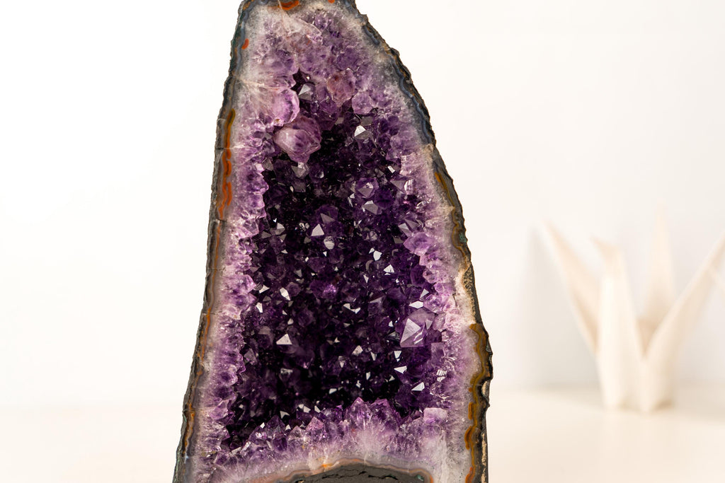 Compact in size yet beautifully formed, this Amethyst geode stands apart from the more common pieces thanks to its saturated druzy and well-defined cathedral formation. It’s a refined addition to a fine mineral collection, a thoughtful gift, or a strong focal element in an interior setting.
