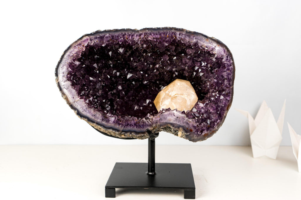 Specimen: Amethyst Geode on Stand with X-Large Calcite