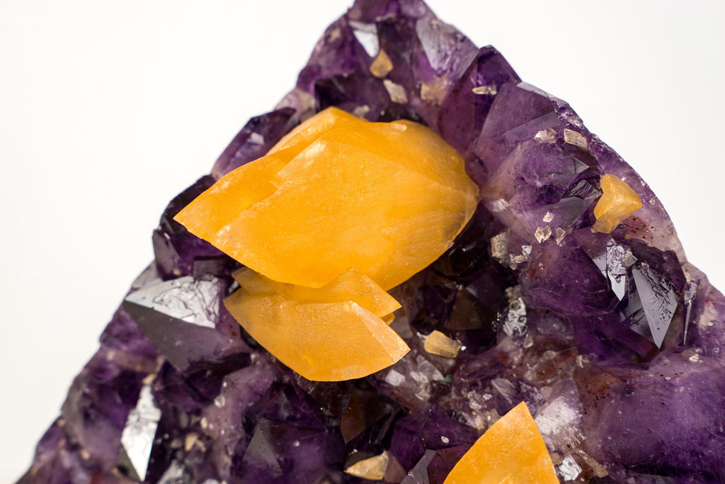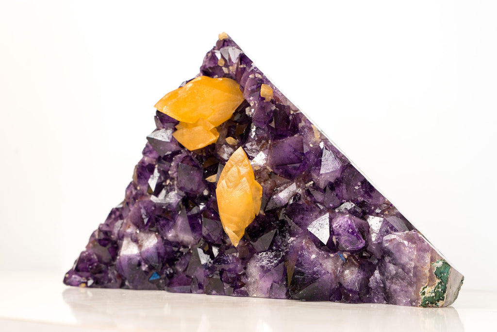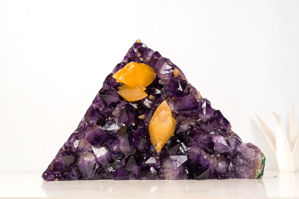 This sculptural Amethyst Cluster features rare orange scalenohedral calcite crystals growing over deep purple amethyst points. The triangular, bold formation creates a highly aesthetic statement piece for décor or fine mineral collections.
