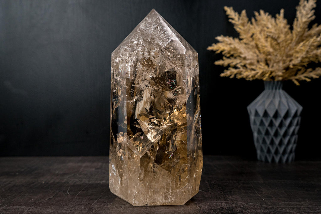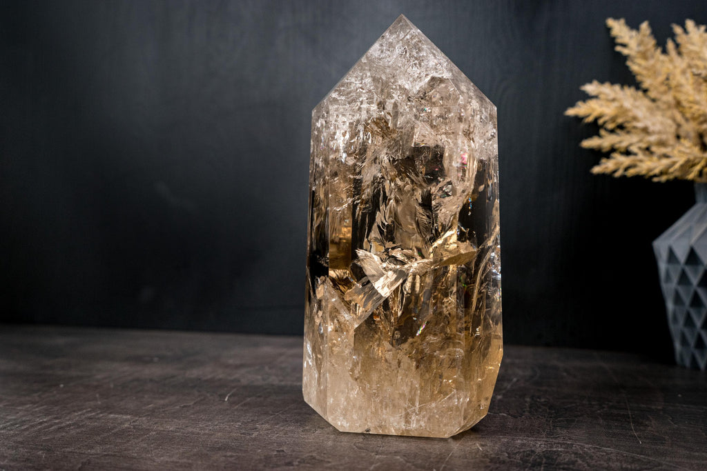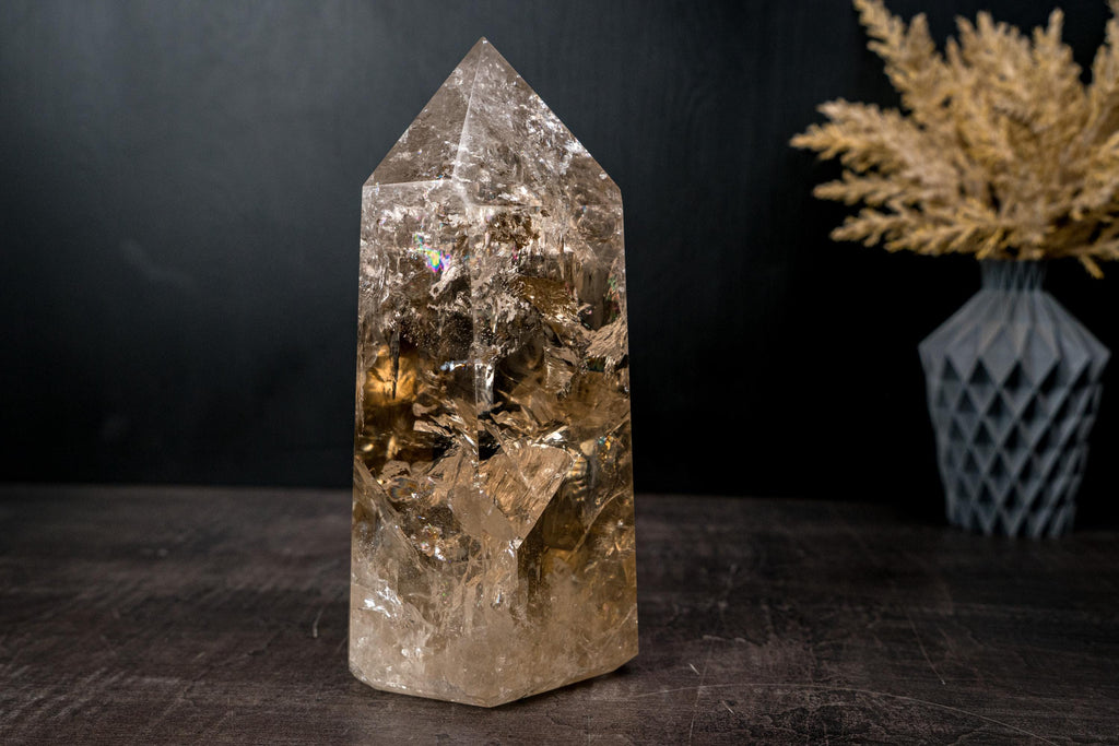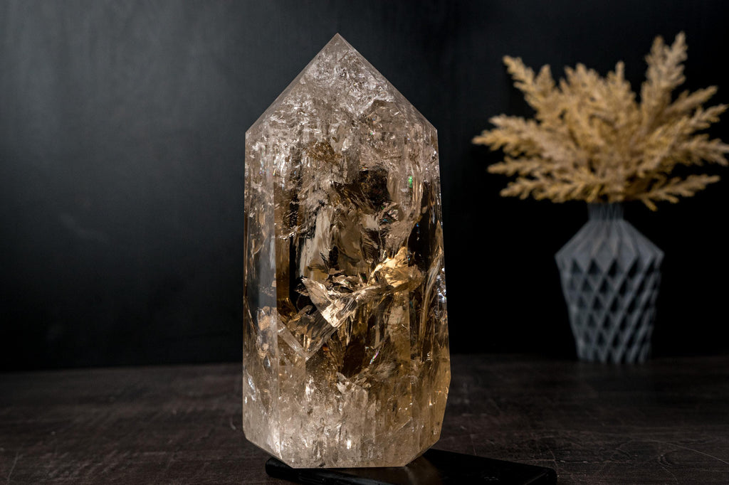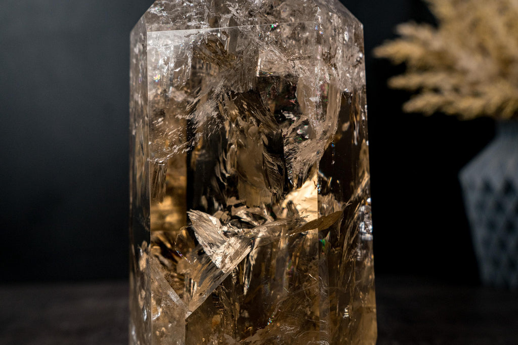 The obelisk rises tall with a beautifully expressive interior, where natural inclusions and internal structures create gentle movement and depth. As light passes through the crystal, it reflects and refracts softly, creating internal rainbows and giving the impression of warmth and luminosity emerging from within.
