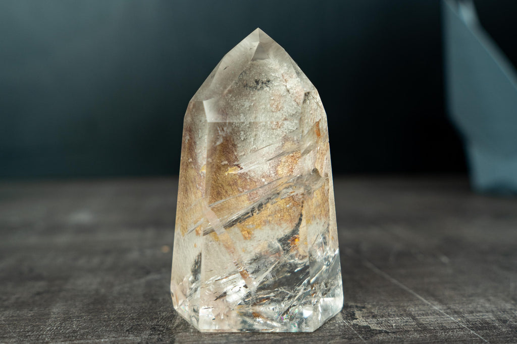 A play of contrasts: raw and polished, water-clear quartz and softly textured white lodolite. This crystal offers a true window into a natural scene inside the stone, where rare white landscape lodolite inclusions create a beautiful view within the quartz. It is a rare piece for a serious collection and an eye-catching display for any curated space.