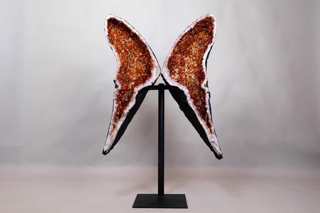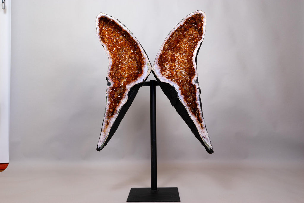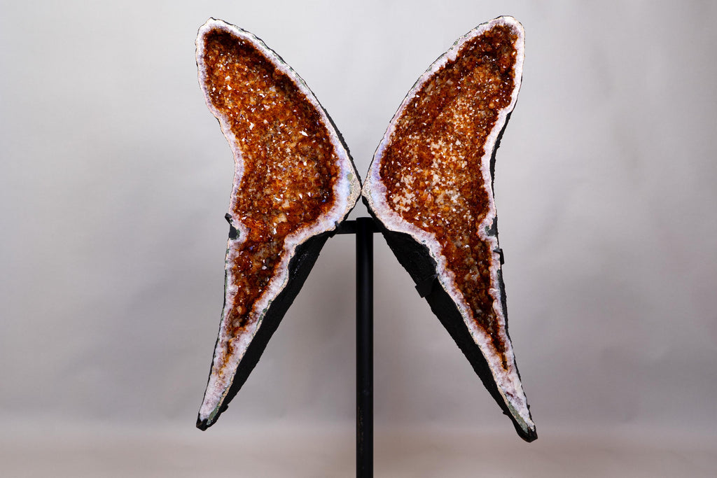 Book-matched citrine wings with this color tone and formation are uncommon. Finding matching pieces with equal color, crystal quality, and harmony is rare, resulting in a sculptural presence that feels intentional and visually powerful.