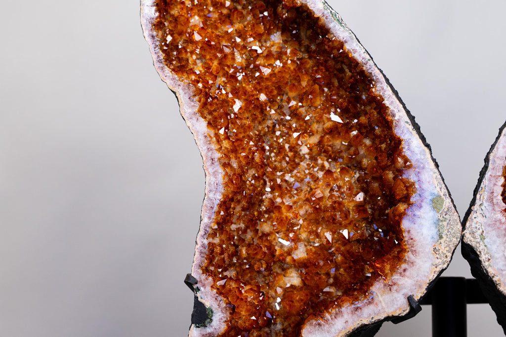 The first feature that captures attention is the deep-orange druzy, also known as Madeira Citrine, the rarest and most sought-after citrine color tone. Both wings display the same rich color, with transparent, naturally polished points that reflect light with a lustrous, mirror-like shine.