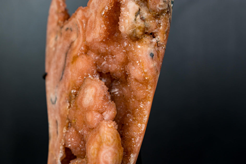 Inside its natural caves, rare botryoidal spheres take center stage — each one coated in delicate peach-colored druzy crystals that resemble sparkling flowers. These formations add texture, depth, and a stunning visual character to the specimen.