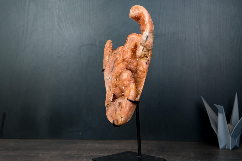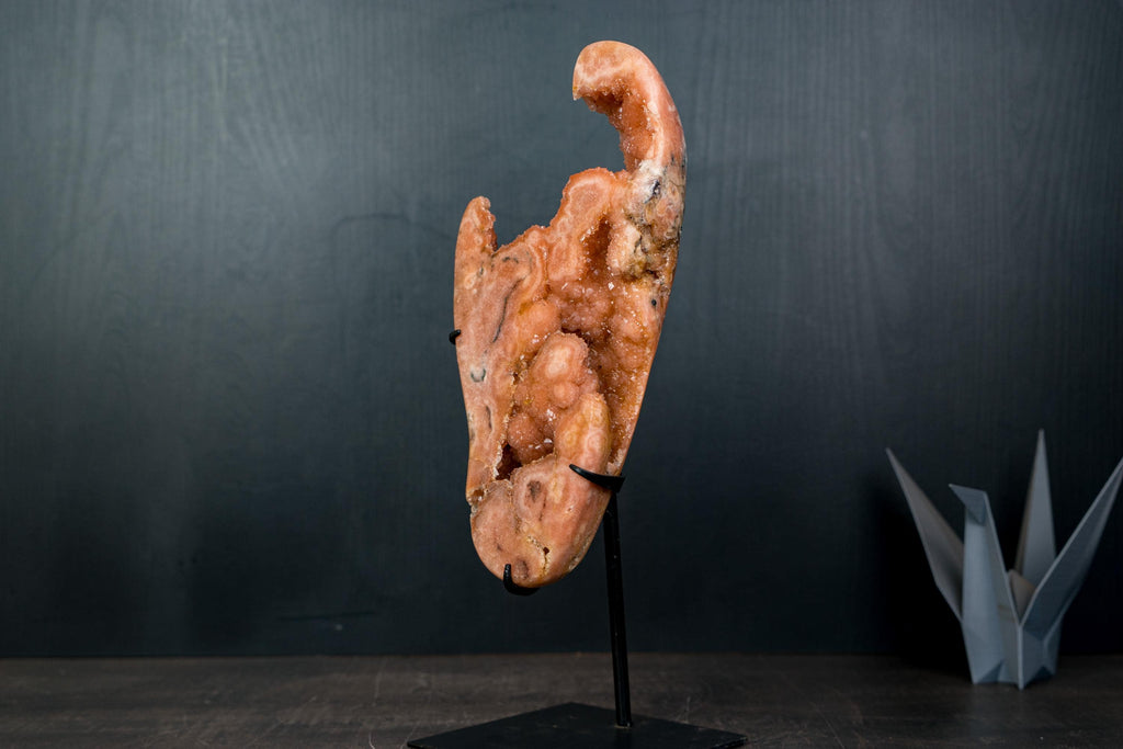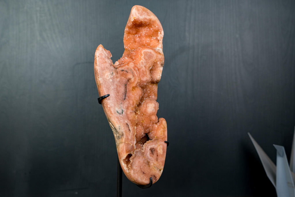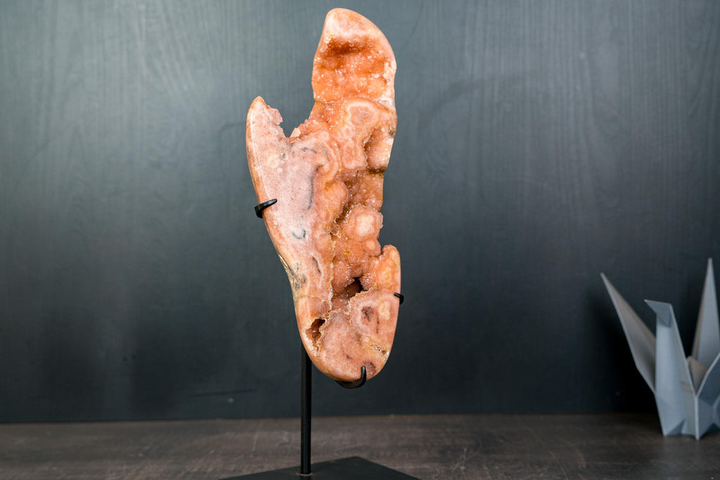 Natural Pink Amethyst Geode Slab with Peach-Pink Druzy Crystals on Stand