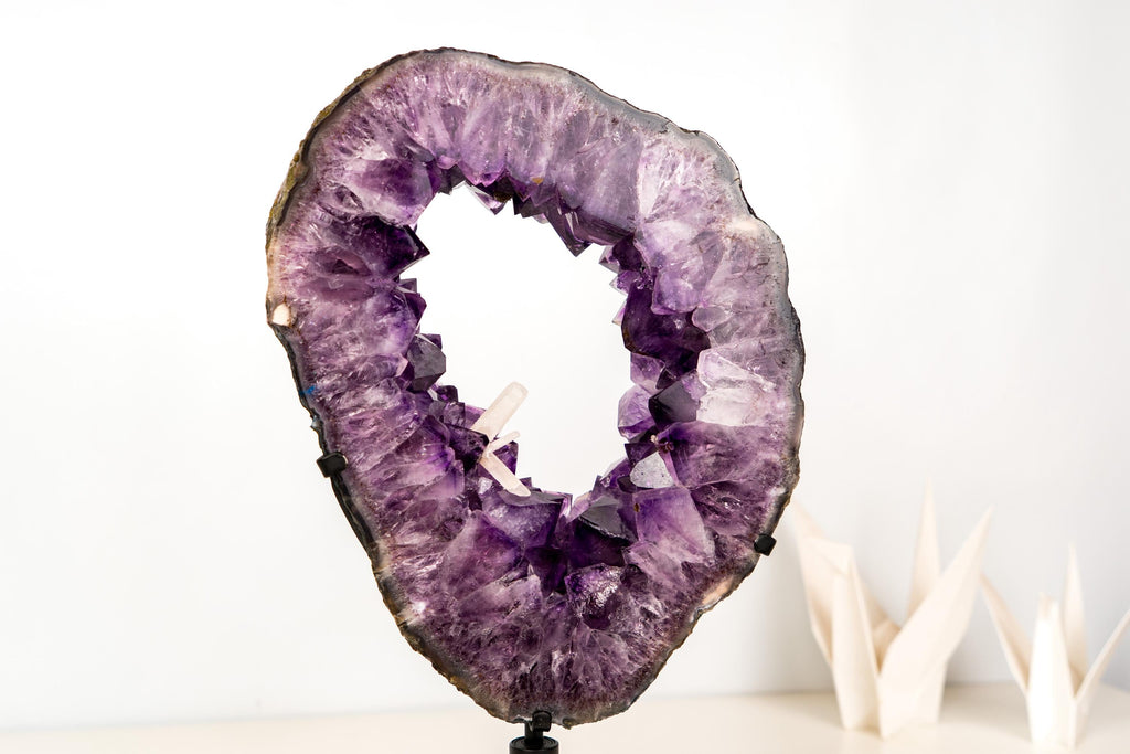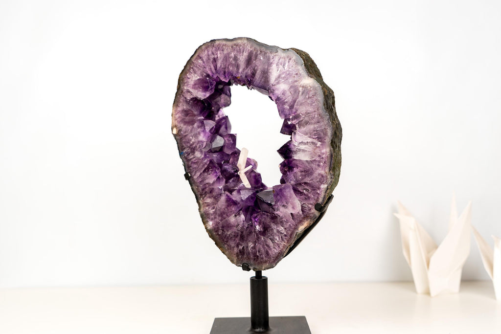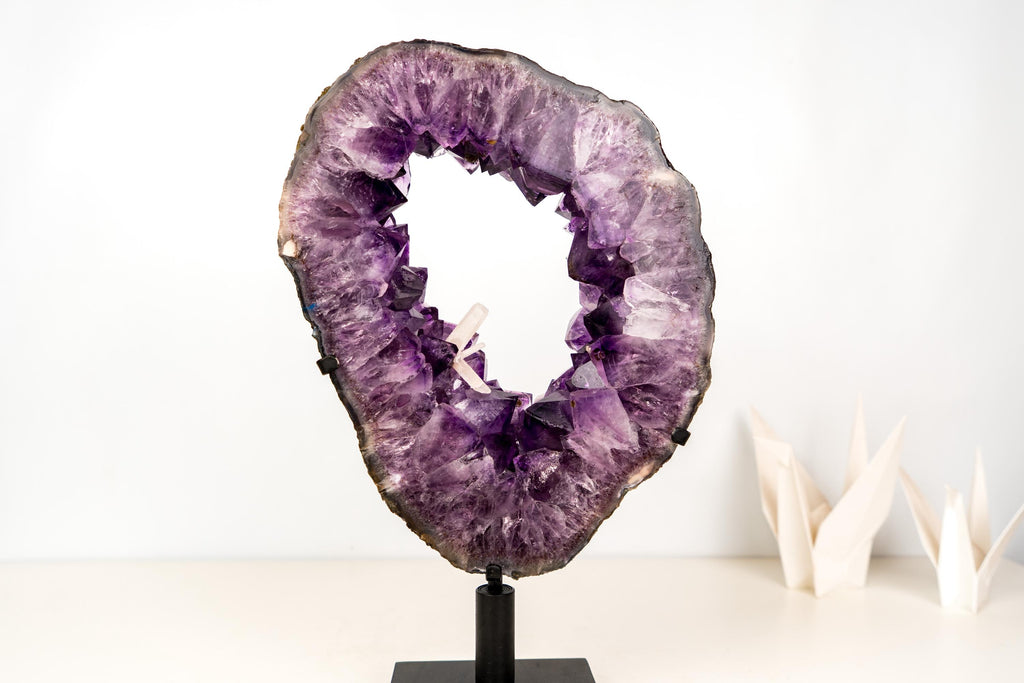 An Amethyst Geode Portal with rare characteristics and remarkable natural beauty. Carefully cut to preserve the calcite inclusions, this specimen immediately draws the eye with its deep purple color and refined crystal formation. Every detail contributes to its presence, making it a true centerpiece for a collection or interior space.