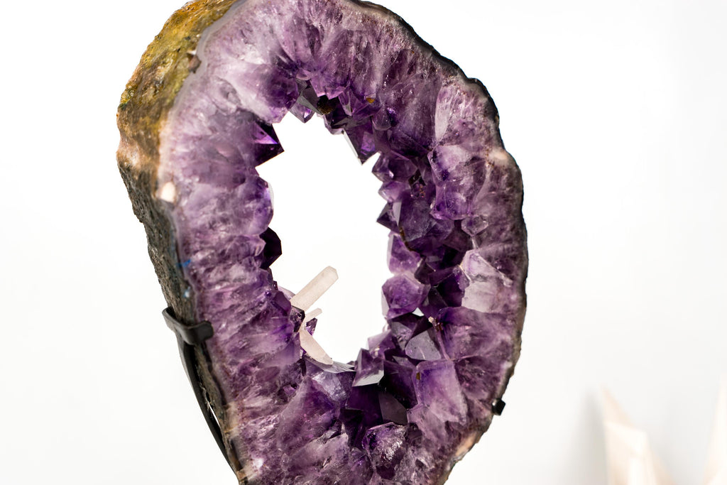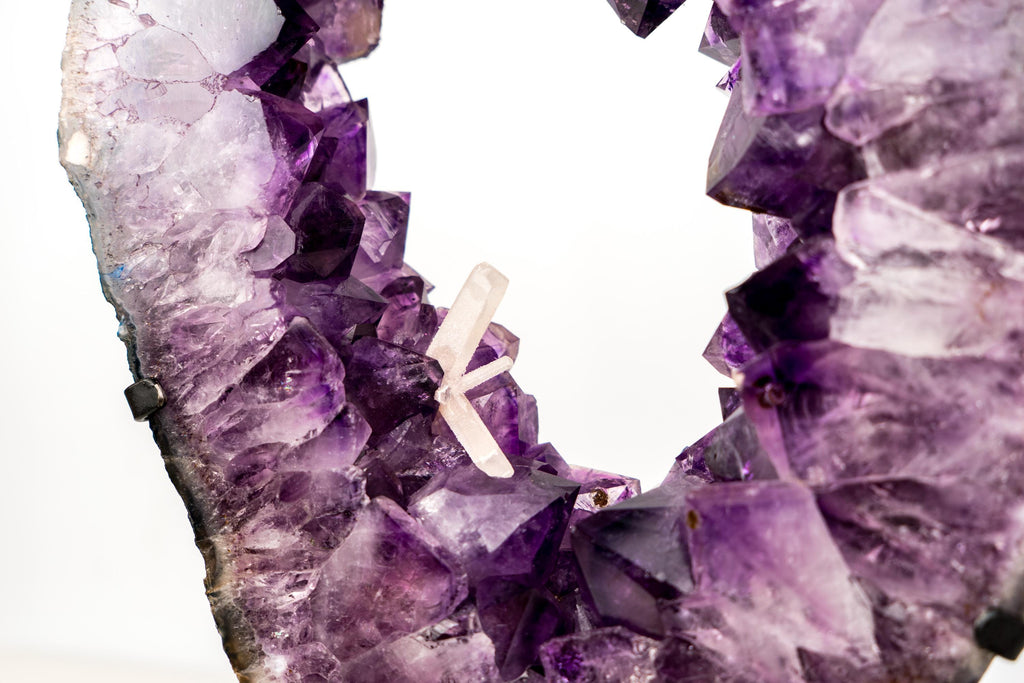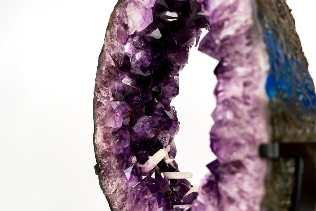 Its amethyst points are remarkably intact, bringing a sparkly character to the piece and creating space for calcite inclusions to develop. Unlike the sharp geometry of quartz, the calcite formed in elongated blade-like and rhombohedral shapes, offering a beautiful contrast against the deep purple amethyst backdrop.