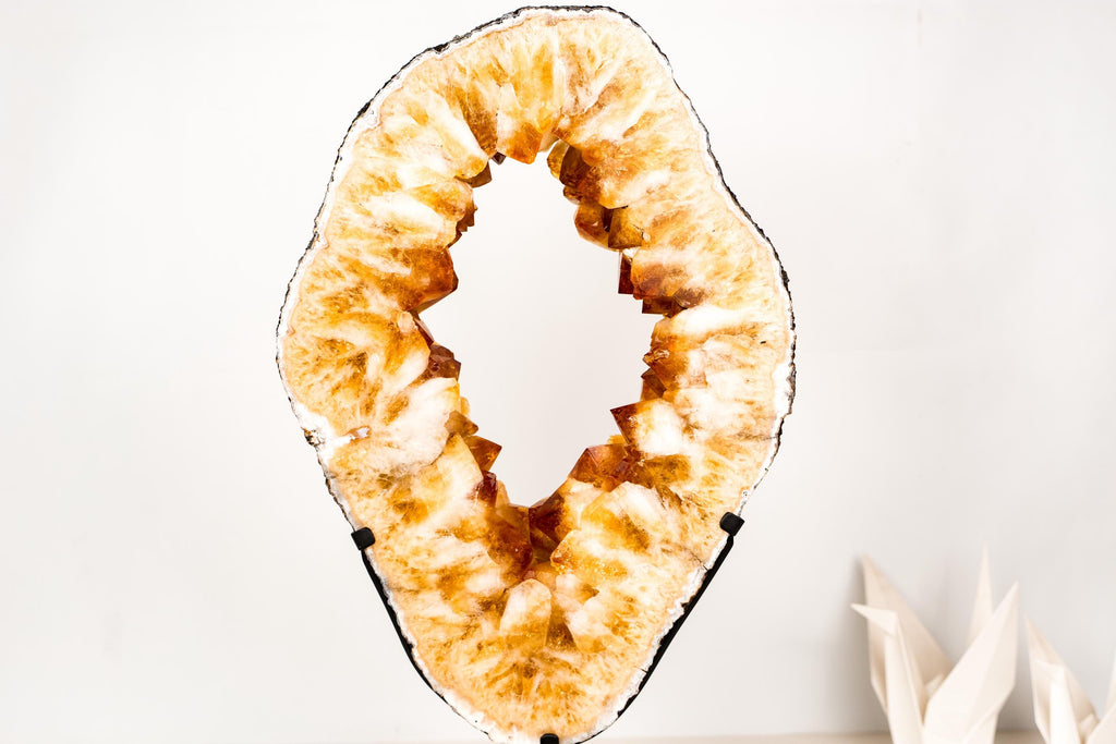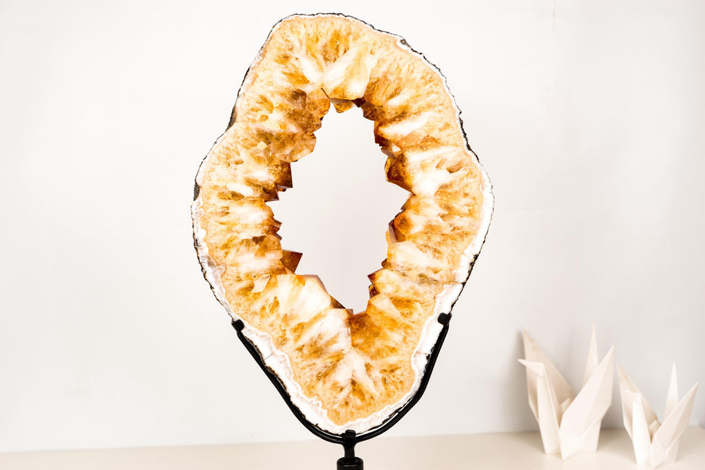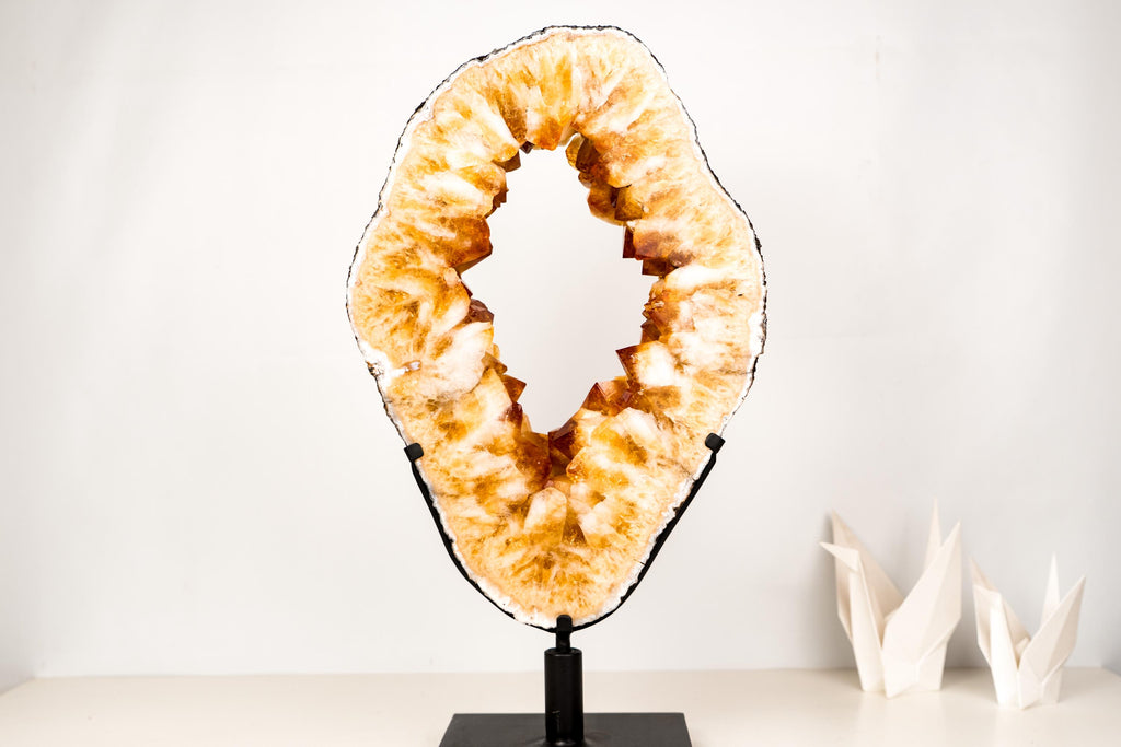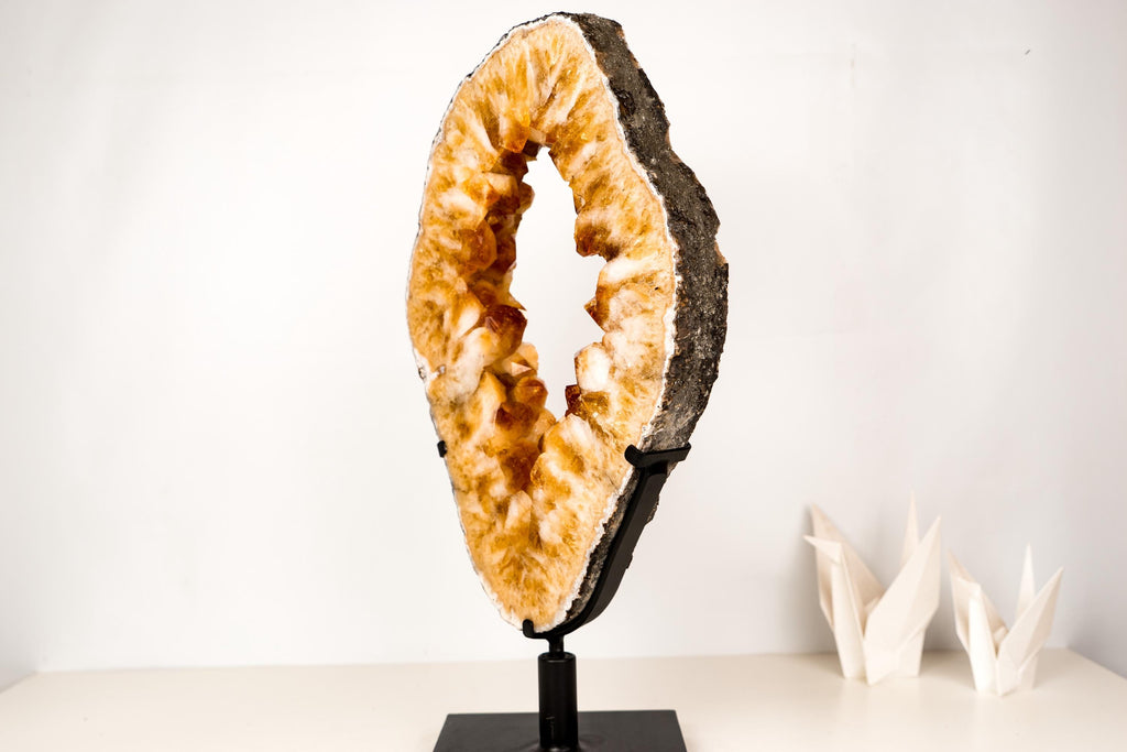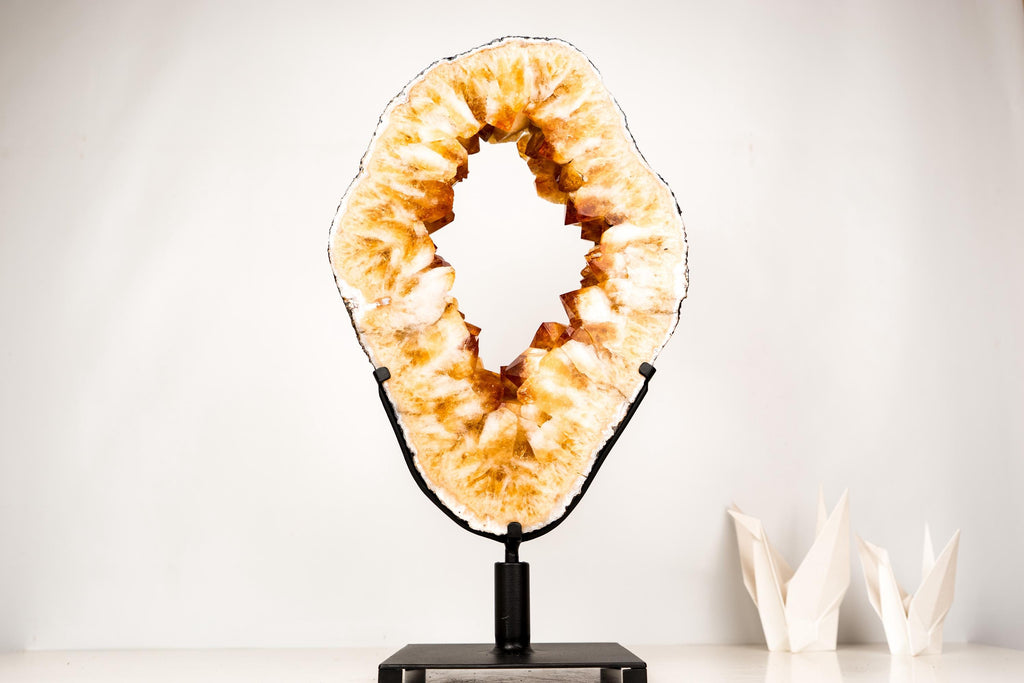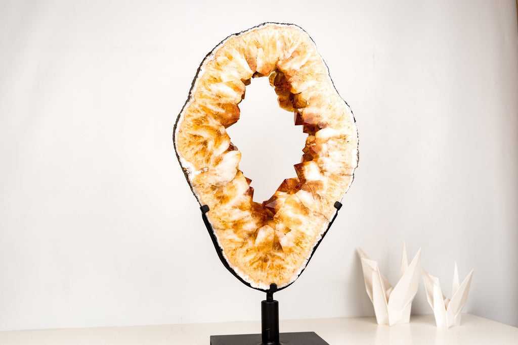 Large Citrine Geode Portal Slice with a Rare Formation, Madeira Citrine on Stand