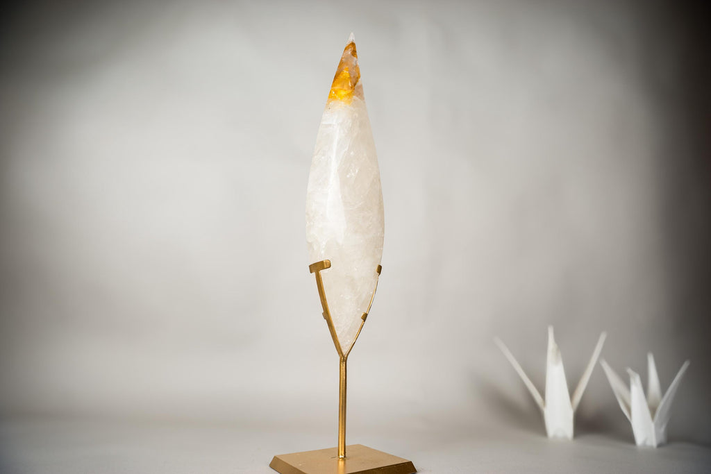 This extraordinary Clear Quartz Flame Sculpture with Golden Healer inclusions is a true masterpiece of natural art and expert craftsmanship. With its delicate flowing lines, soft reflections, and impressive size, it captivates the eye as a striking centerpiece or refined statement piece for any space.