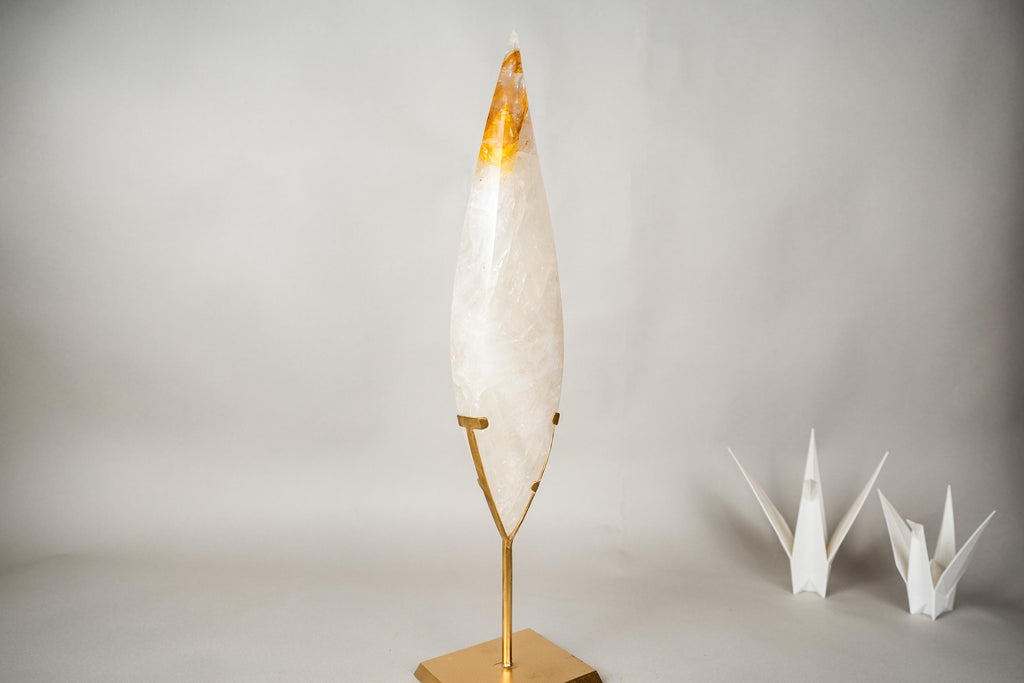Shaped by hand with decades of lapidary expertise, the artisan captured the fluid motion of natural fire through refined curves and a sharp, upward-pointing tip. The sculpture’s form evokes vitality and balance, while the inclusions within the quartz give it an otherworldly glow that changes with the light.