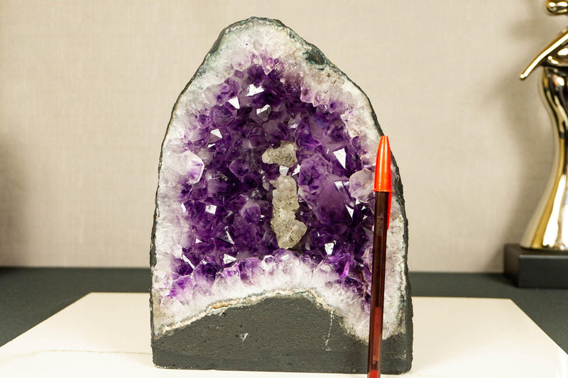 A beautiful small Amethyst Geode which comes a beautiful calcite formation on the back of the geode, this specimen brings deep purple Amethyst druzy on a 14 Lb, compact Brazilian amethyst specimen.