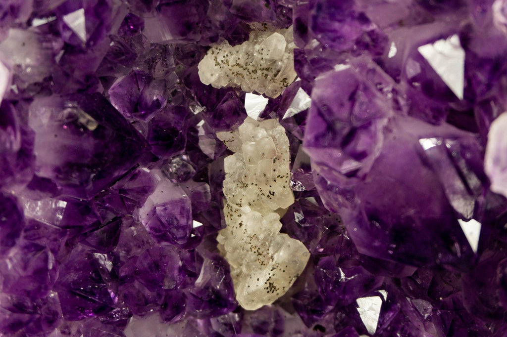 The mix of the calcite inclusions with the deep purple amethyst points is the main characteristic of it. The calcite formation is intact, and brings quartz formation at its top. The points are of superb quality, very large, super clean and well arranged, forming this purple landscape.