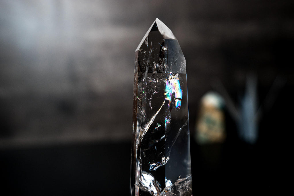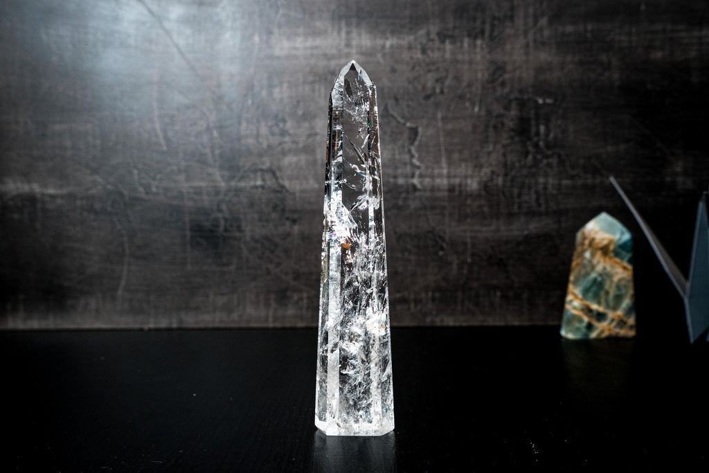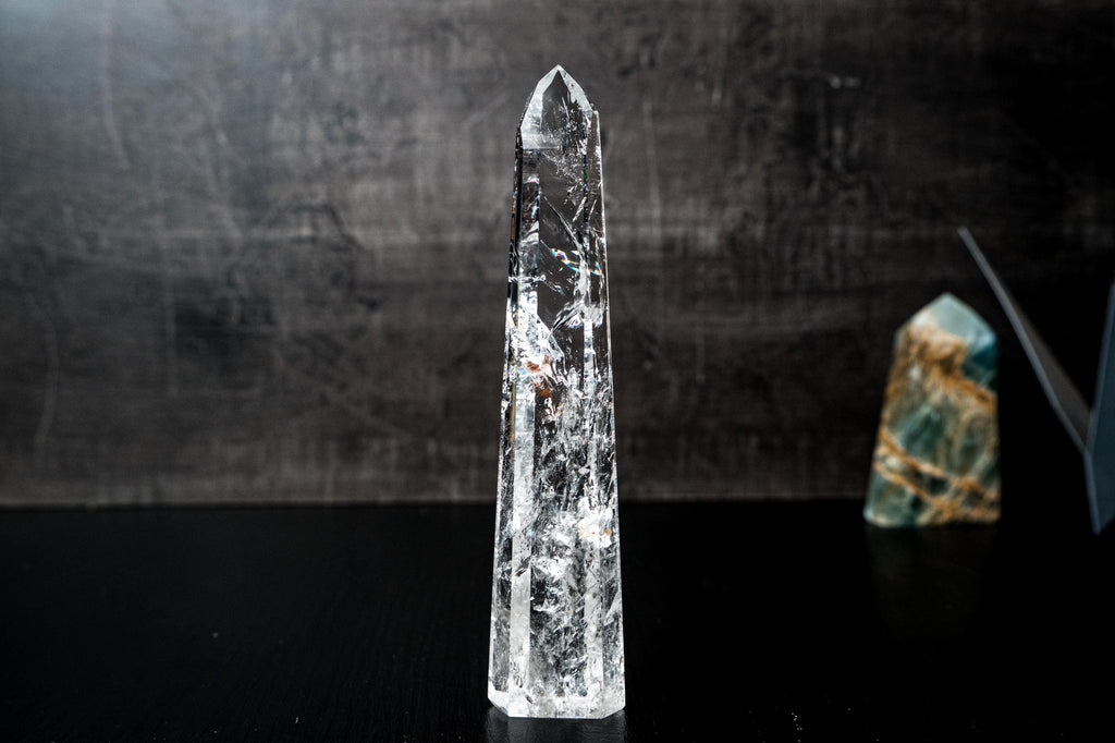 Aesthetic, powerful, and crystal clear, this quartz obelisk is a refined example of a water-clear quartz point, featuring a perfectly terminated point and many internal rainbows visible at its core.