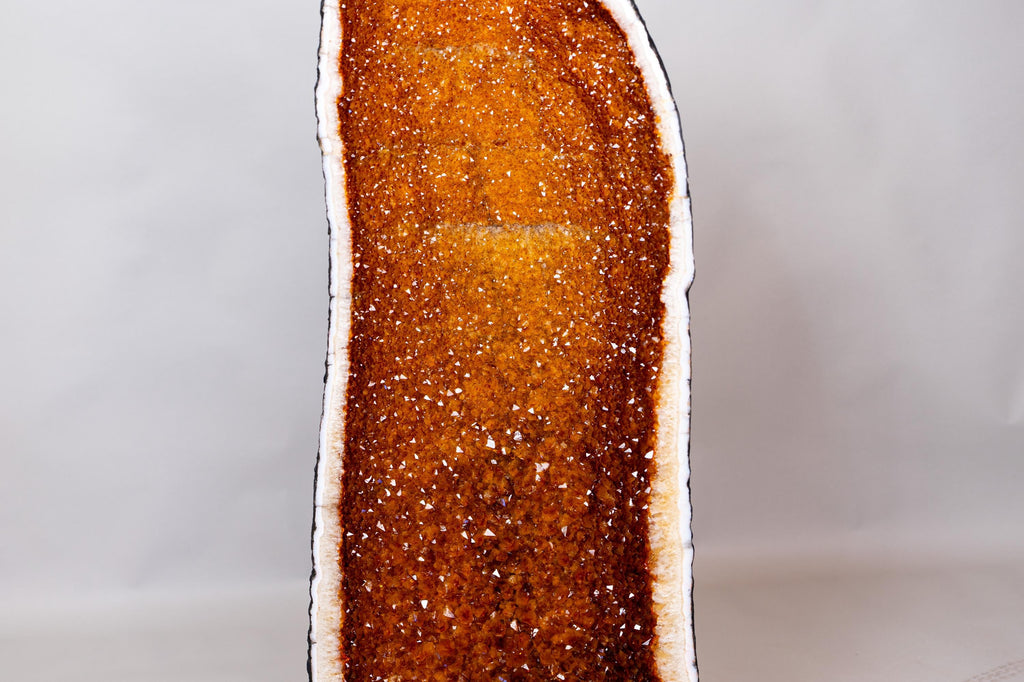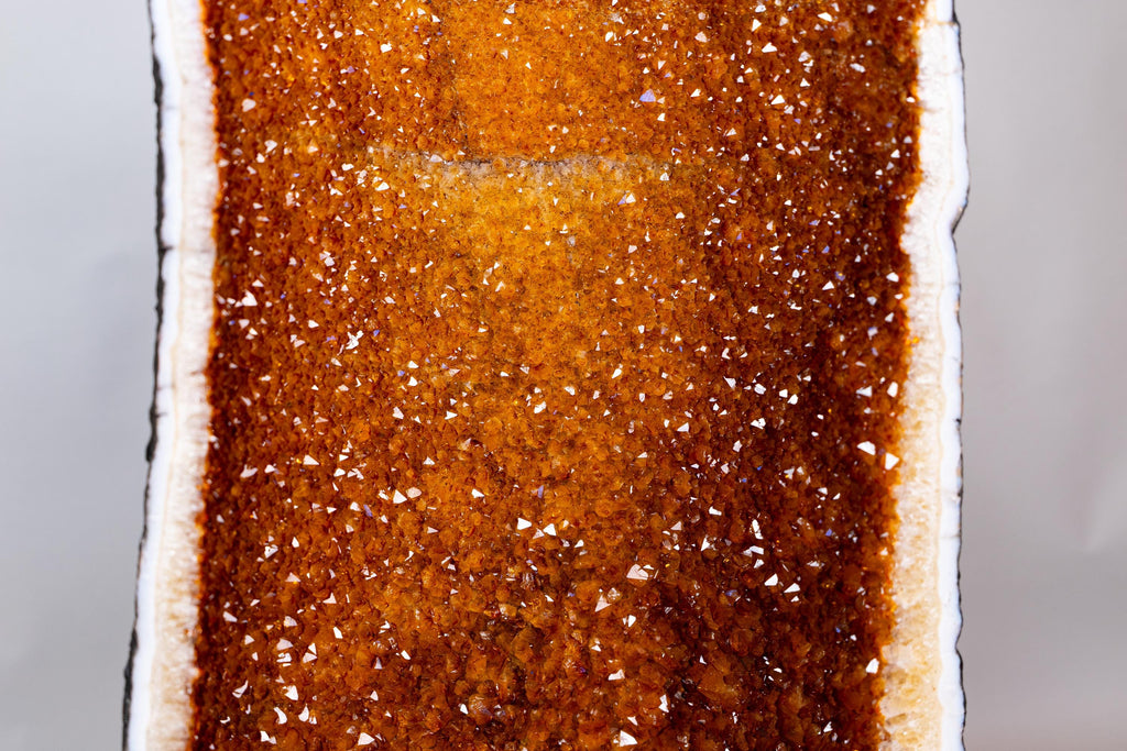 The golden-orange druzy points are the first to catch the eye. This rare color develops in a soft natural gradient, beginning with deeper Madeira tones at the base and gradually becoming lighter toward the top. Naturally polished, the crystals maintain a beautiful glow even in the deeper sections of the geode. Framing the formation, the white quartz matrix surrounds the citrine like a natural border, creating fiery, landscape-like scenes throughout.