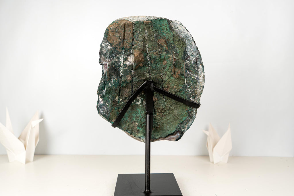 This geode is entirely natural, with polished borders and back that accentuate its forms and colors. Please check the photos for more details, and feel free to reach out with any questions or special requests.
