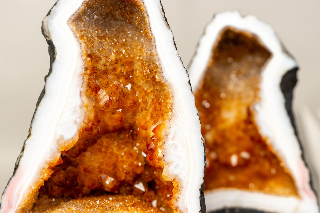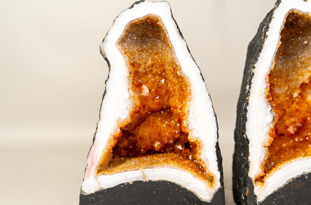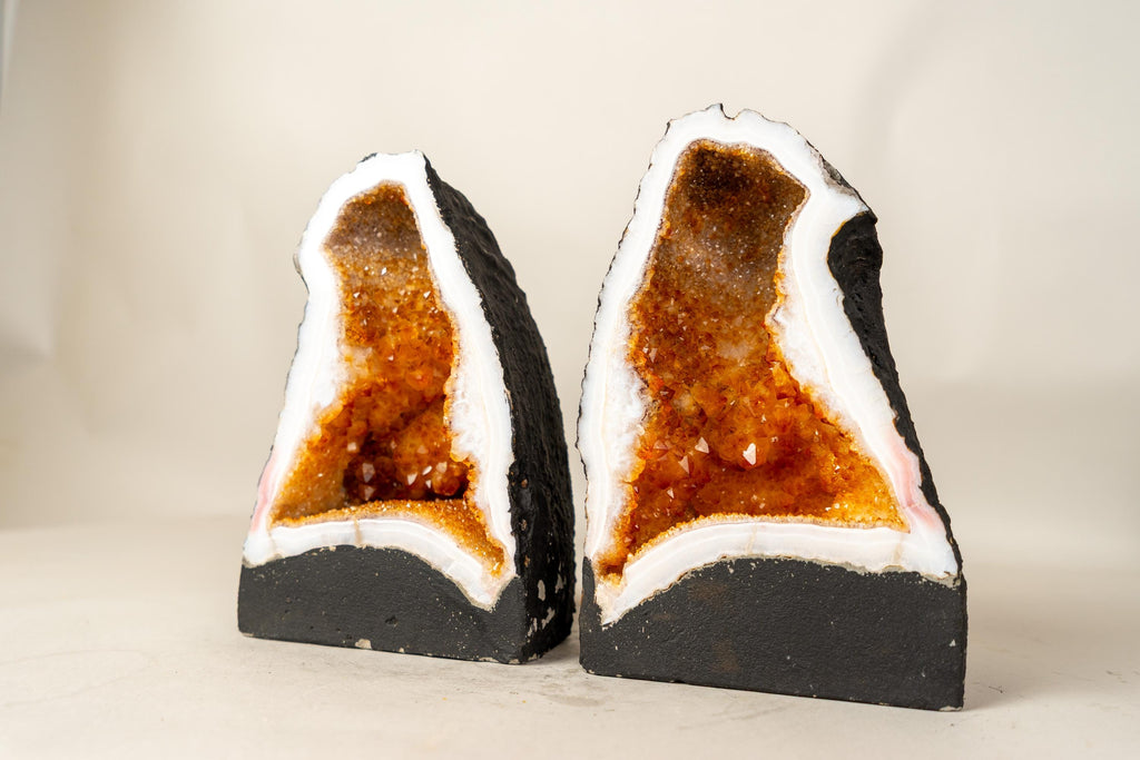 Pair of Bookmatched Citrine Geodes with Sparkling Rich Orange Druzy and Unique Natural Formation