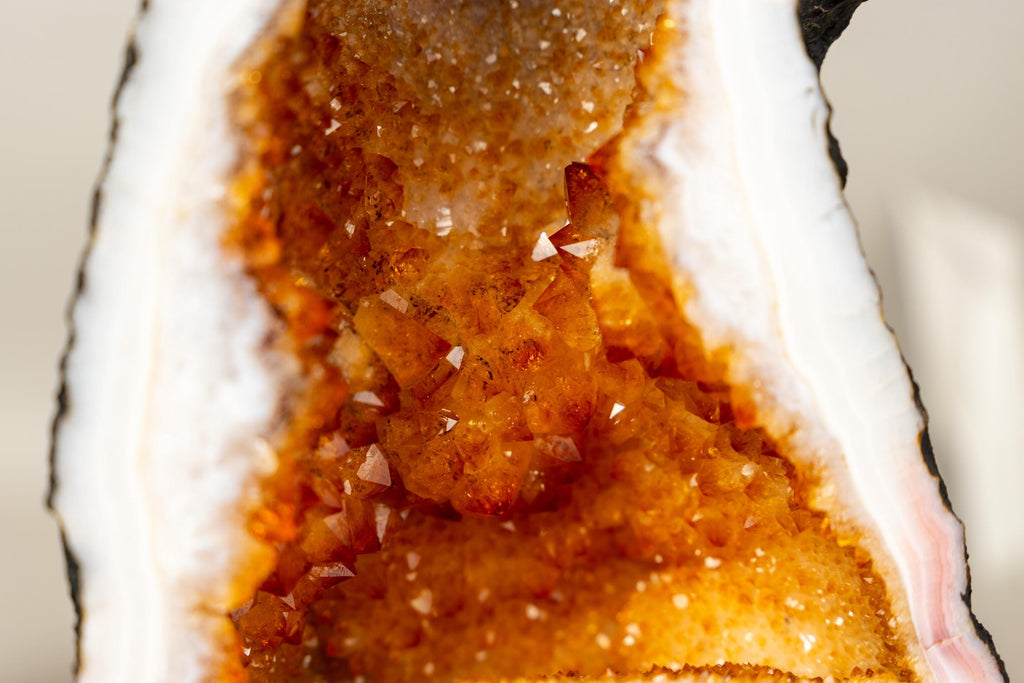 The druzy crystals within each geode shimmer with intense orange tones, their perfectly formed points displaying remarkable brilliance and clarity. The white crystalline frame encircling the citrine core enhances contrast and depth, creating a striking natural artwork that looks both vibrant and harmonious.