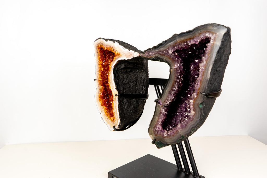 This finely aesthetic book-matched pair of Amethyst and Citrine geodes showcases a naturally sculptured wing-like formation, remarkable for the high quality of both specimens. The Amethyst displays a deep, natural purple tone, while the Citrine reveals a vivid and rare deep orange hue. Both pieces feature beautiful Golden Goethite inclusions, adding character and uniqueness to this one-of-a-kind natural artwork.