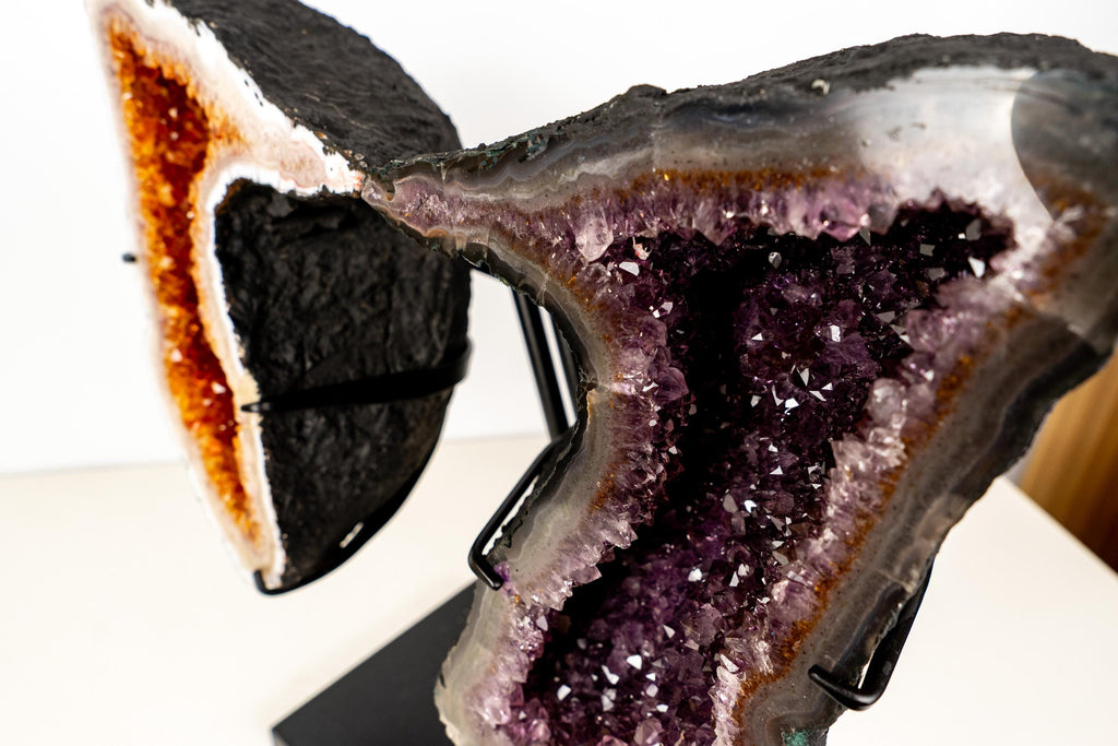 The format of the geodes is another special characteristic. Nature shaped the original cavity in such an unusual way that, once cut, it revealed a sculptural symmetry resembling butterfly or angel wings. Both the Amethyst and Citrine geodes are framed by natural agate layers, adding structure and contrast to the formation.