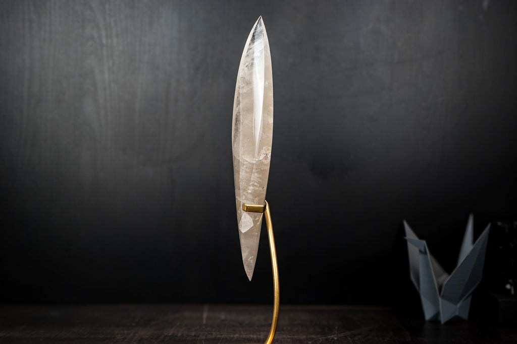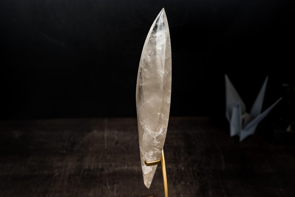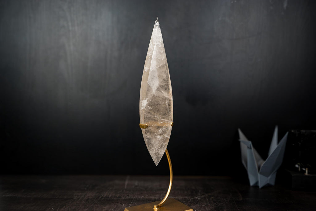 Carved from a raw piece of clear quartz sourced from Diamantina, Brazil—a region celebrated for its highly energetic and exceptionally clear quartz—this sculpture showcases dramatic internal lines, shimmering rainbows, and a natural brilliance that captivates from every angle.