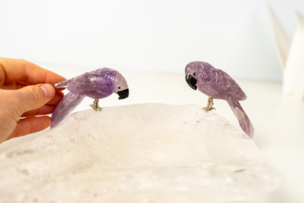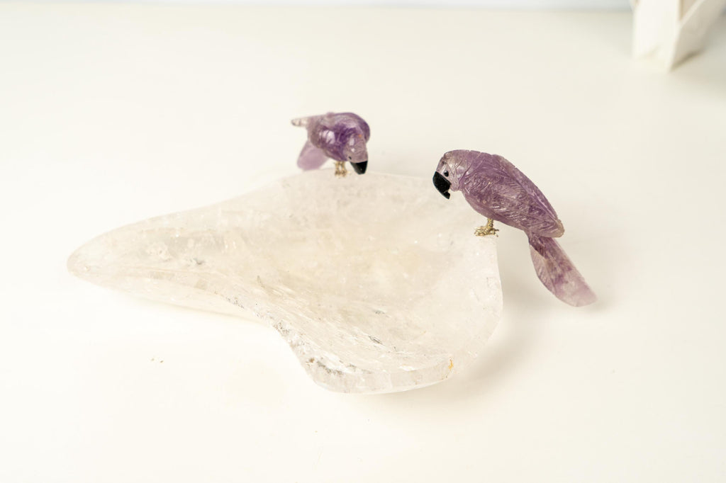 Specimen: Pair of Hand-Carved Amethyst Parrots on Clear Quartz Bowl