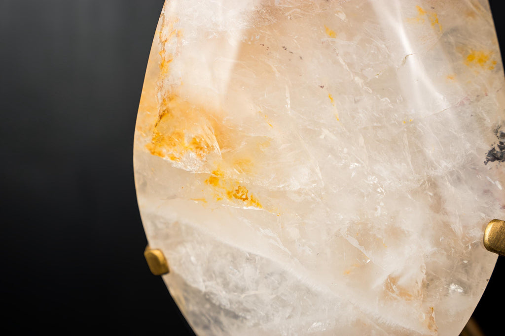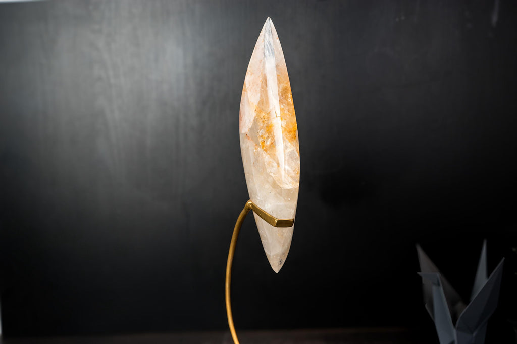 The sculpture rests upon a gold-colored custom metal stand that complements the natural tones of the quartz. Designed specifically for this specimen, the base provides both elegance and stability—enhancing the visual impact of the piece while maintaining a refined, minimalist aesthetic.