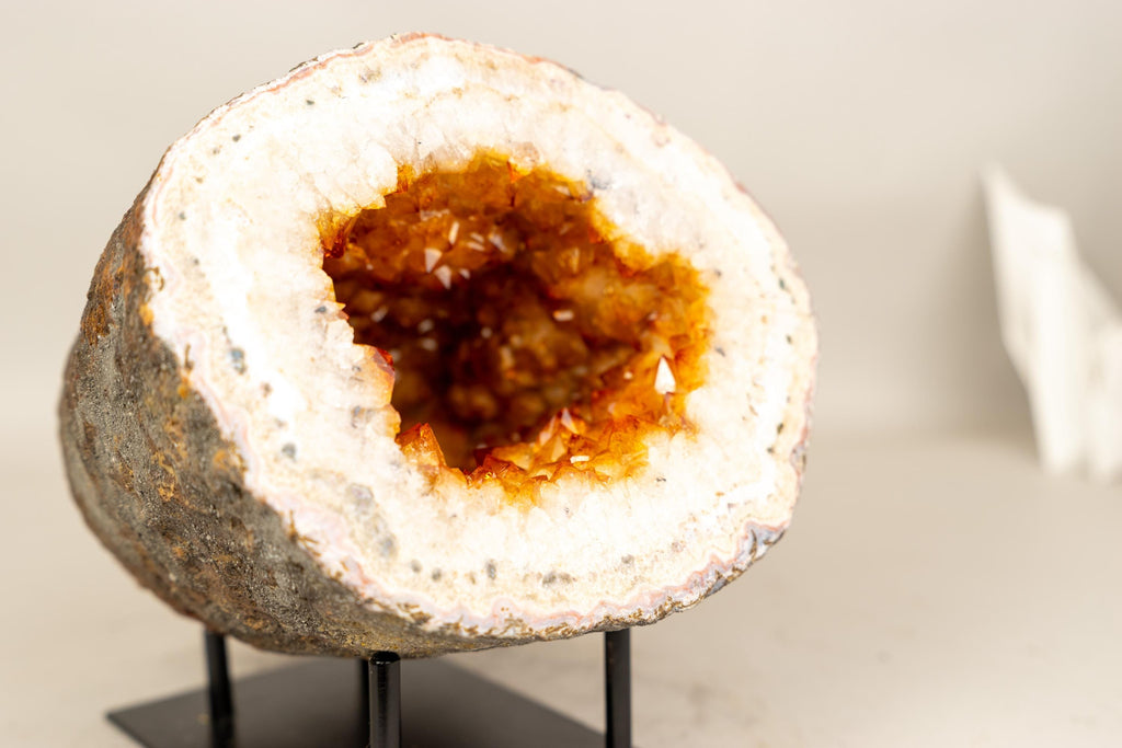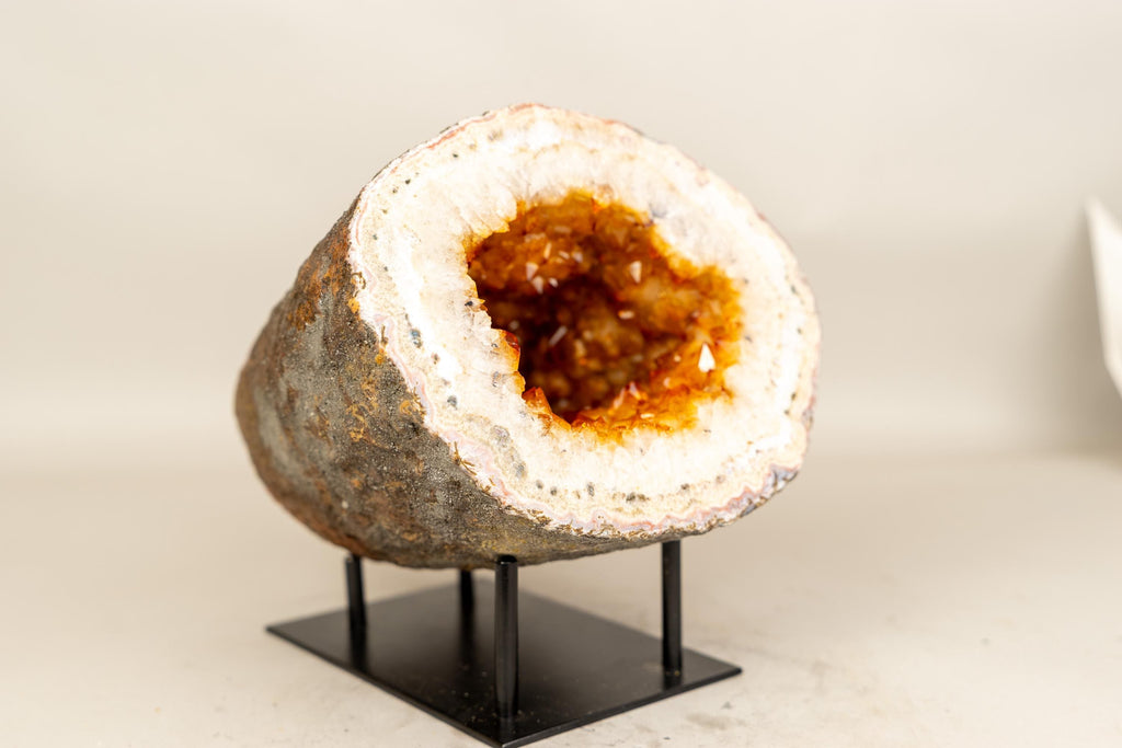 Natural Citrine Geode Cave with Golden-Orange Druzy on Quartz Frame