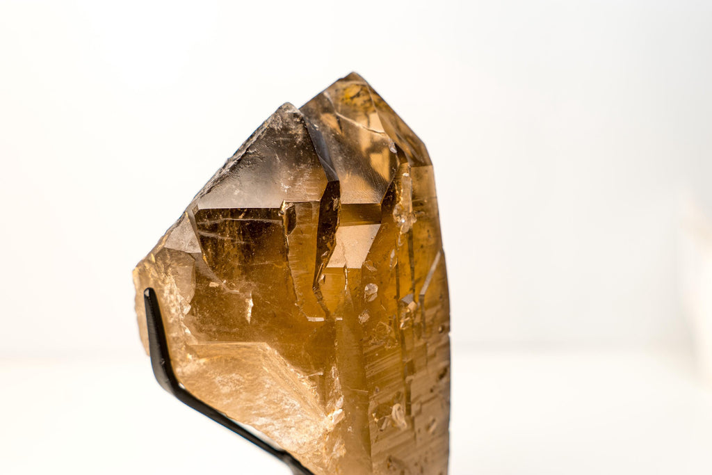 This citrine stands tall with a defined main point and columnar elestial crystals growing along its side, giving it both presence and elegance. The tip has been lightly polished to reveal its warm and vibrant interior.